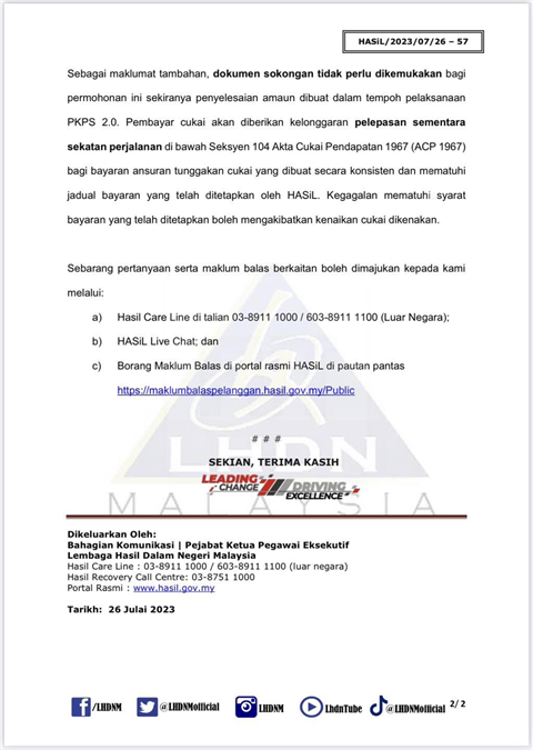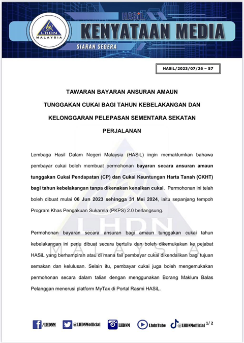 稅務局在26/7發出通告,那些被稅務局禁止出國的民衆,可以在6/6/2023-31/5/2024之間申請分期付款及解禁。